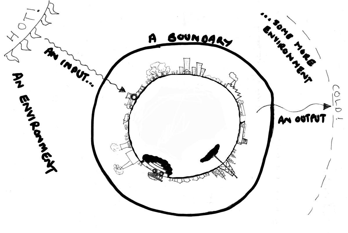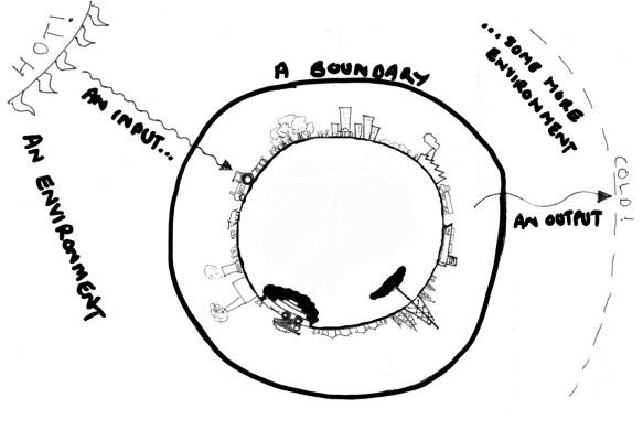 We can conceive of our home, the planet Earth, as a system—a whole comprised of parts—for which some environmental factors of particular relevance to the situation in which we’re interested are the (much!) higher temperature of the Sun (driving a system input in the form of short-wavelength radiant heat transfer), and the lower temperature of surrounding space (driving a system output, again in the form of radiant heat transfer, but at much longer wavelengths). Relevant parts for this system—keeping firmly in mind that relevance is a matter of the particular interests that we hold, and hence is always a potential subject for debate—include fossil fuel deposits contained within the Earth’s geological formations, humanity’s global industrial economic infrastructure (including that of natural resource production, industrial manufacturing, agricultural production, food processing, transport, construction etc), and the myriad infrastructures of domestic production and consumption. For reference, here’s a very rough sketch of the situation we’re looking at in systems terms: