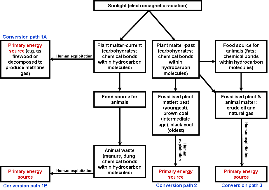 The fossil fuel deposits we understand to have formed when plant matter (coal) and plant and animal remains (oil and gas) became buried and sequestered in geological formations over many millions of years. These naturally-occurring deposits are the accumulated product of solar-powered biological processes over vast—in human historical terms—time spans. For reference, conversion pathways from sunlight to plant-based primary energy sources are sketched out in the figure below: