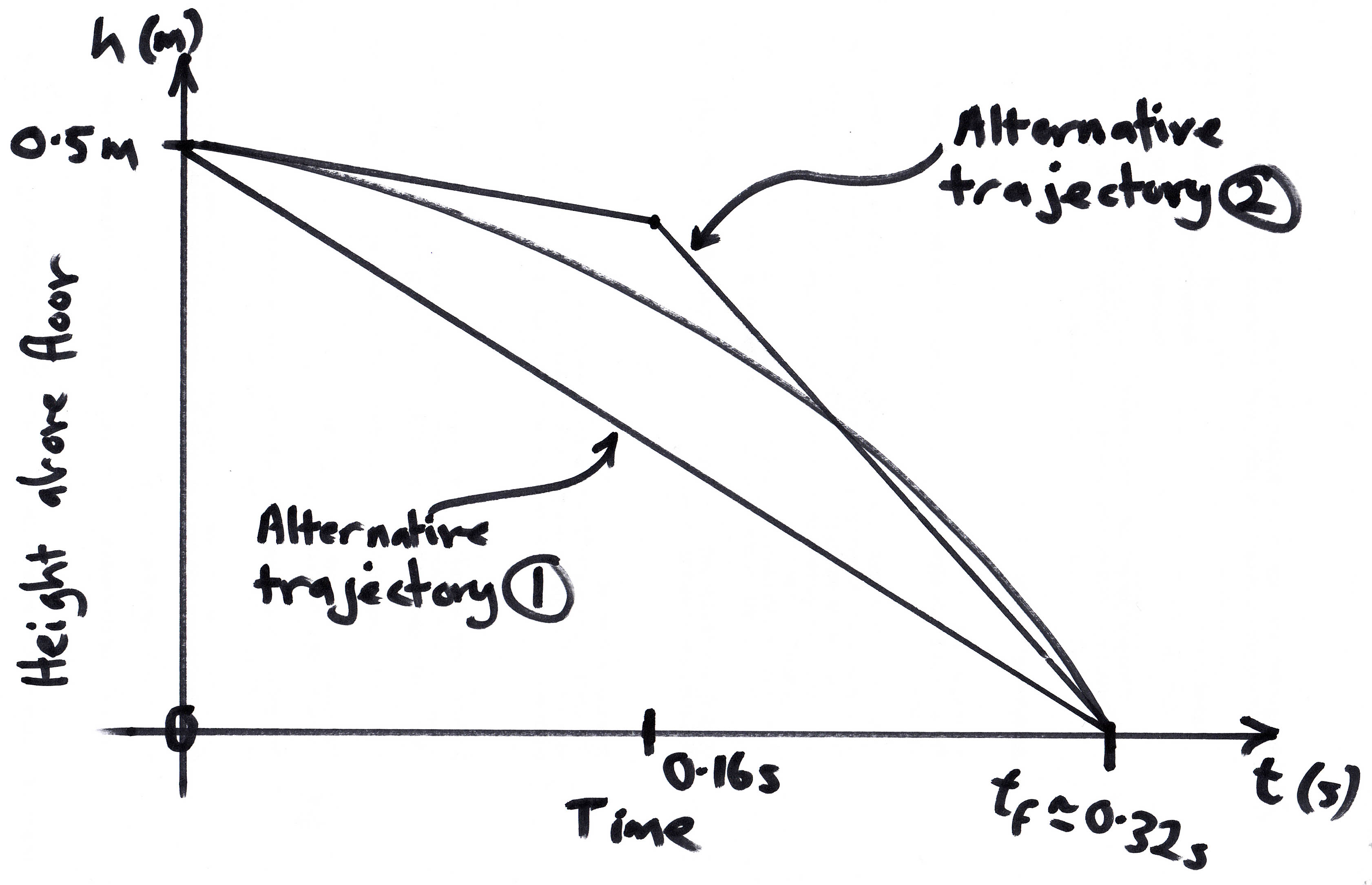 This alternative approach requires that we know only two things about the motion: its start and end points, in space and time. If we know by experimental observation that the bottle falls from its start position to its end position in 0.32 seconds—or, perhaps even more significantly, if we want to design a system that will achieve this as a pre-defined objective—it’s possible to imagine an infinite number of trajectories that would achieve this result. In the illustration below, two such imaginary trajectories are depicted, along with the actual trajectory for which we previously determined the equation of motion using the start-to-finish methodology.