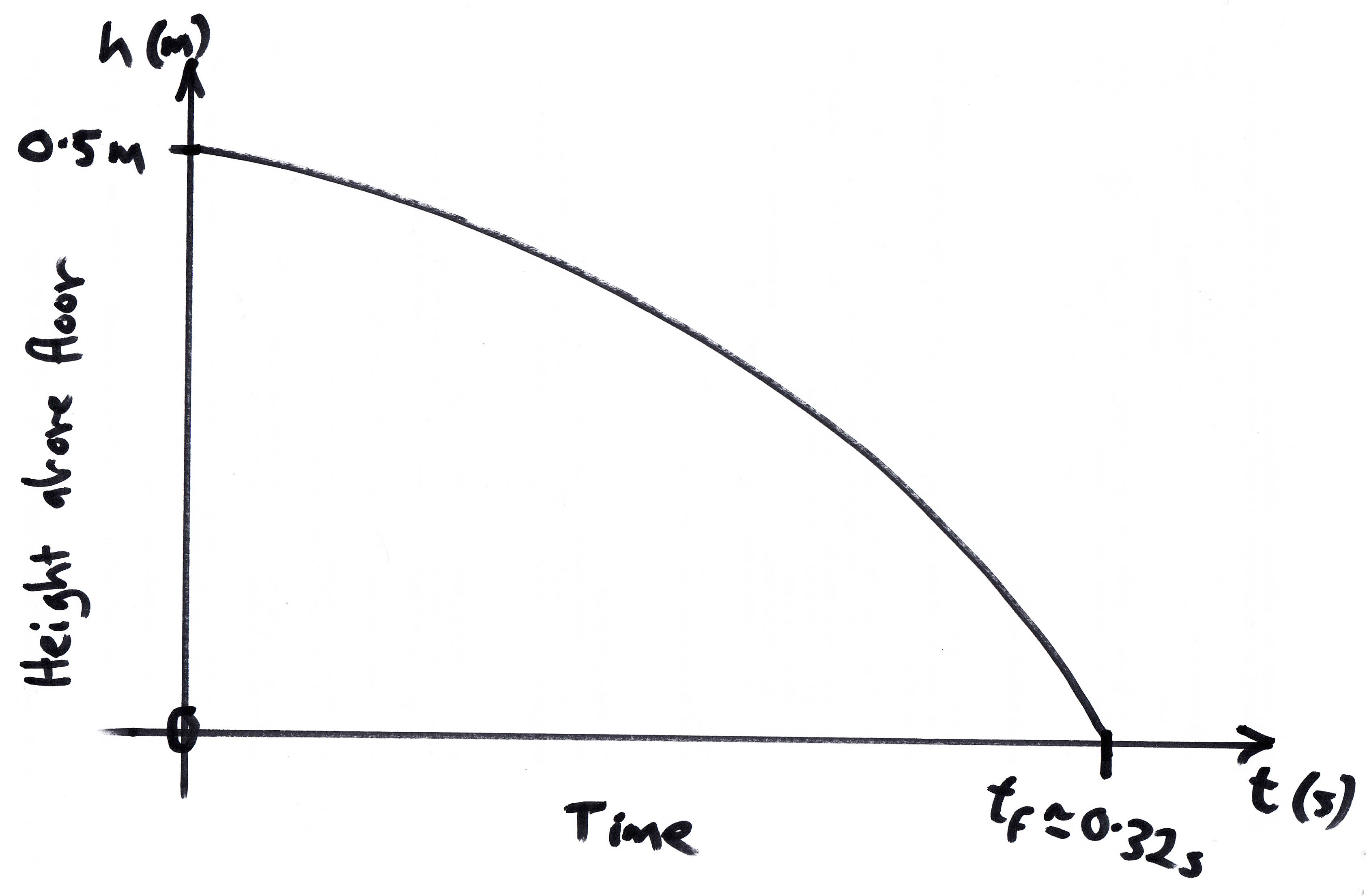 The first graph below depicts the actual trajectory followed by the bottle as it falls from chair height to the floor. Trajectory here just means ‘the height of the bottle above the floor at every time between starting its motion and reaching the floor’. For a simple system such as this, given that the physics is very well understood, we can work out the bottle’s equation of motion with respect to time by, in effect, calculating where the bottle moves to in the time instant after it is released, and the instant after that and so on until it reaches its destination (the floor). Once we have the equation of motion, we can calculate the height of the bottle at any time, t, after it is released. So in our example situation, we know from the outset what the trajectory should look like, and how the actual bottle would behave in practice. This allows us to plot the trajectory, as roughly illustrated in the sketch below. Of particular importance, we now know the position of the bottle at the start and finish of its motion (this is obvious and trivial—the system behaviour that we’re interested in is the movement of the bottle from chair height to floor height), and we know that the motion finishes approximately 0.32 seconds after it starts (tf on the graph).
