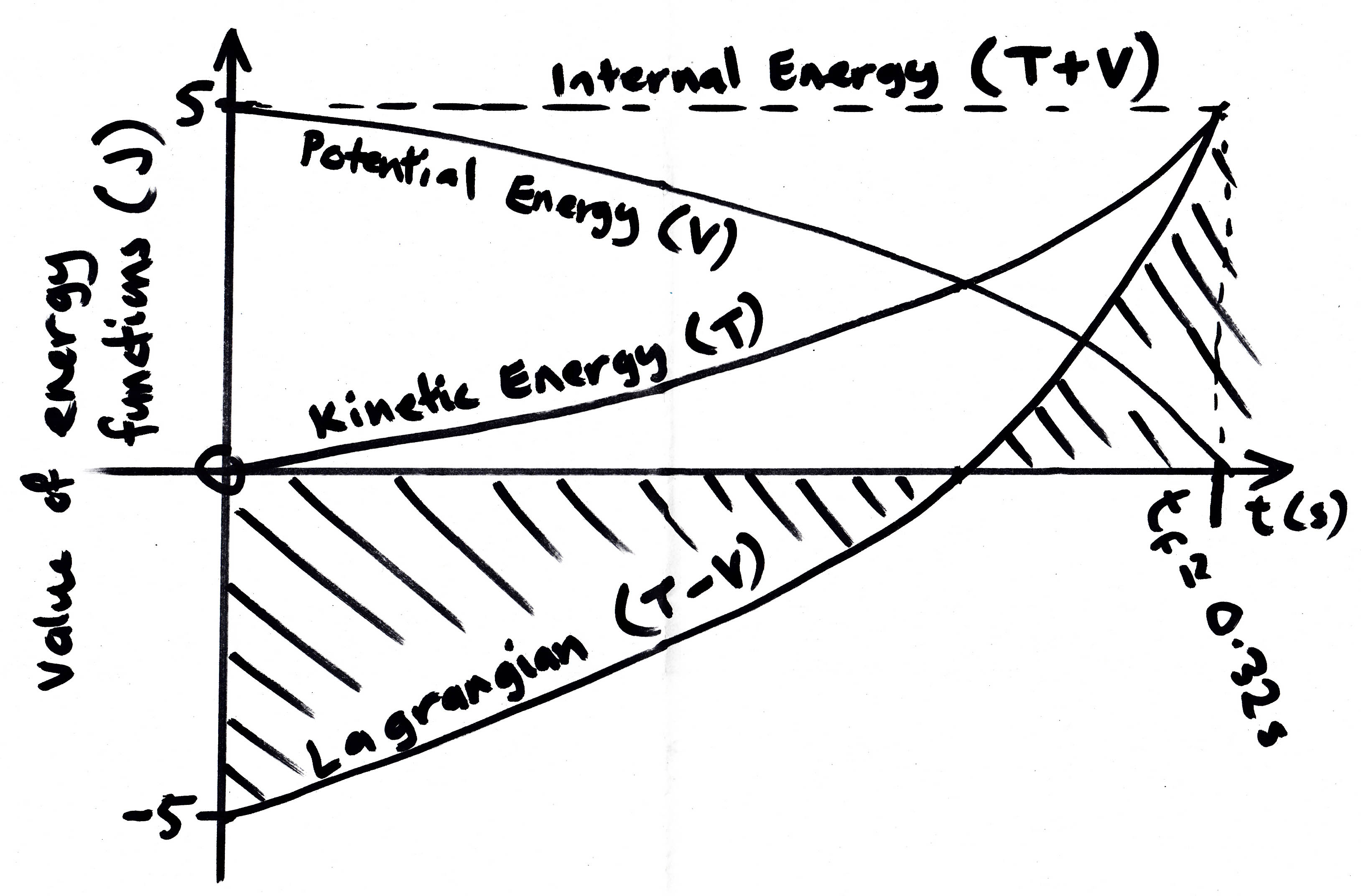 The curves marked as potential energy and kinetic energy simply describe the changes in those quantities as the bottle drops from chair seat height to the floor: at the start, kinetic energy is zero, potential energy is 5 J. At the end (time tf, approximately 0.32 s), just as the bottle reaches the floor, kinetic energy is 5 J, potential energy is zero. If we add up the values of kinetic energy and potential energy at all times and plot the resultant values on the graph, we get the horizontal dashed line marked as internal energy—as we expect, internal energy is constant, or conserved. By subtracting the potential energy from the kinetic energy at all times and plotting the resultant values, we get the curve marked as Lagrangian. This changes from -5 J at the start, to +5 J as the bottle reaches the floor. Now we get to the important part: the action is represented by the shaded area on the graph, between the Lagrangian or (T – V) curve and the time axis. The area to the left of the point where the Lagrangian crosses the axis has a negative value; the area to the right of this point has a positive value. Adding these two areas, we get a net area value representing the action. Given that the negative area (area below the time axis and to the left of the crossing point) is greater in magnitude than the positive area (area above the time axis and to the right of the crossing point), the overall action is negative.