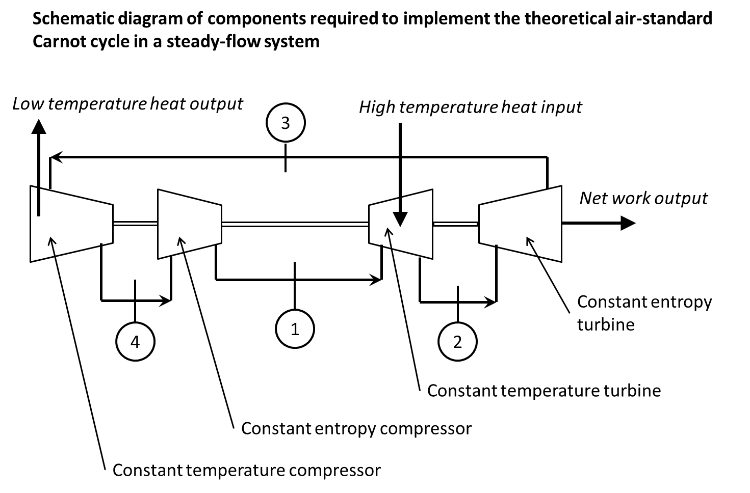Figure 1: schematic diagram showing arrangement of equipment that could in theory be used to implement the air-standard Carnot cycle operating with steady-flow.