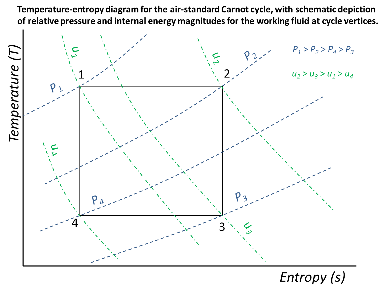 Figure 2: Temperature-entropy diagram for the air-standard Carnot cycle, showing the relative magnitude of pressure and specific internal energy at each of the cycle vertices.