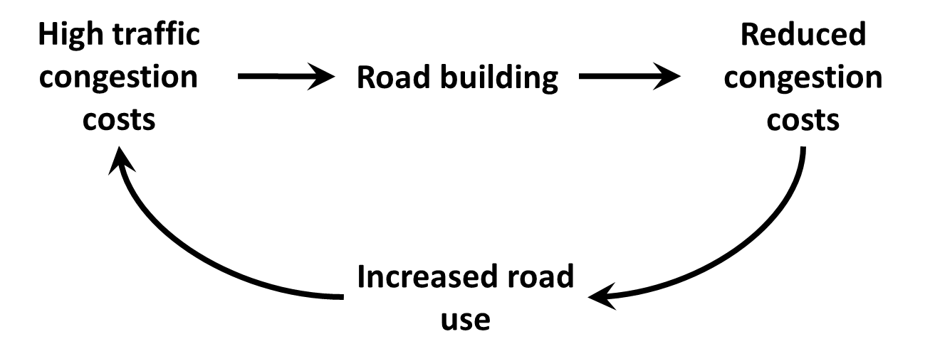 The cyclical view of causation—again in perhaps its simplest form—takes the view presented in Figure 1 as given, and then also recognises that reduced congestion costs have flow-on implications for road use. If costs of congestion go down, then driving becomes more affordable, and road use increases through some combination of existing road-users traveling further and new road-users taking advantage of the available space. This has the effect of eroding the cost reduction benefit provided by the road expansion, increasing traffic congestion costs again (usually after some time delay during which the initial intervention seems to have been successful). This simple view of cyclical causation is depicted in Figure 2.