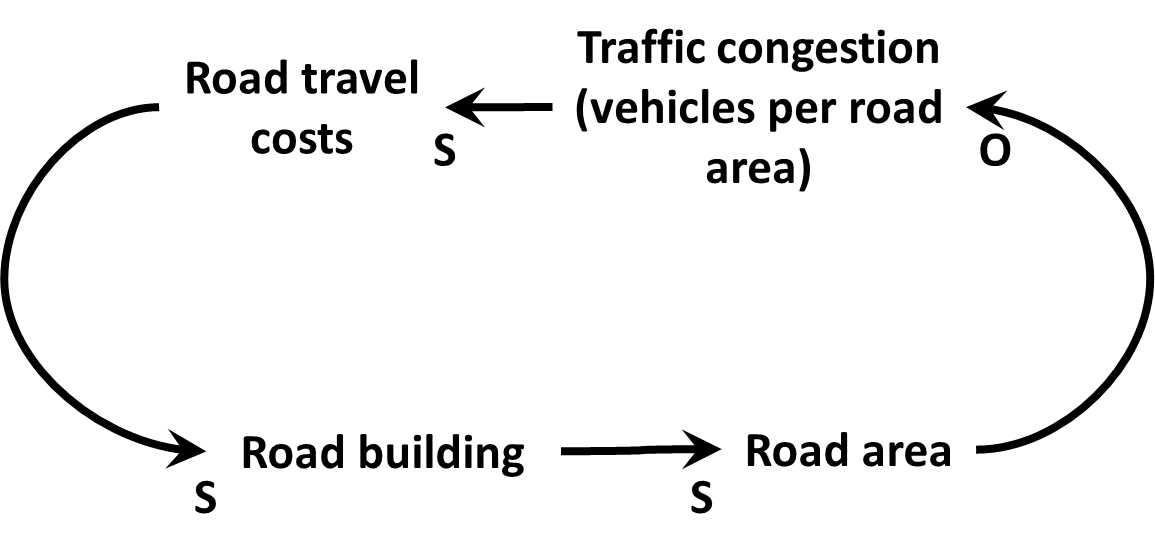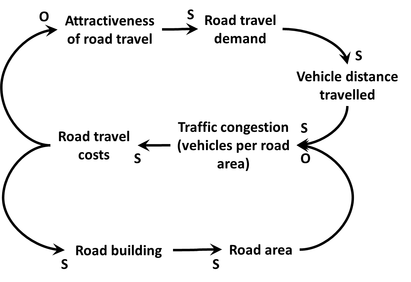 I’ll build up the more nuanced cyclical view in two steps, illustrated in Figures 3a and 3b. As will be obvious from Figure 3b, I’m constructing this more complex account by taking the single causal cycle or loop in Figure 2, and dividing it into two separate causal loops that can be treated as dealing with relatively independent aspects of the situation that nonetheless interact with one-another. The first loop—Figure 3a—in fact starts by taking Figure 1 and rendering it in cyclical rather than linear terms, by recognising that “high traffic congestion costs” and “reduced costs” are two states of the same variable, traffic congestion costs. Road building activity is carried out to reduce this variable, and in isolation of other considerations—i.e. ceteris paribus or “all else being equal”—such a response seems pretty reasonable (what is not reasonable, as it turns out, is the assumption, of all else being equal, itself). Figure 3a depicts a simple negative feedback loop—a causal cycle intended to reduce traffic congestion and the costs associated with it. The letters “S” and “O” in the diagram stand for “same” and “opposite” respectively. An “S” indicates that where the preceding variable increases or decreases, the succeeding variable will change in the same direction; and an “O” indicates the opposite of this—where the preceding variable changes, the succeeding variable changes in the opposite direction to it. If traffic congestion increases, then road travel costs increase also, and vice versa. On the other hand, if road area increases, then traffic congestion decreases (and vice versa). By following a specific change—say an increase in road building—around the loop, we find that road travel cost reduces i.e. it is indeed a negative feedback or balancing loop. Note that this still leads to a very simple depiction of the situation. It combines together two distinct types of variables—stocks and flows—without differentiating between them as rigorously as is needed to deal with all possible changes in the situation. A more sophisticated approach that does formally distinguish stocks from flows would be required for building a functional mathematical model of the situation. For instance, the variable road building represents a “flow” of new road area into the variable road area, a “stock” of all road area, existing and new. If road building activity reduces, road area actually continues to increase, but at a slower rate. For road area to decrease, we’d need to include a flow away from road area called something like “road destruction” (and as we’ll see a little further on, actually including this would not be so silly as it might sound at first, given what the cyclical view of causality reveals).