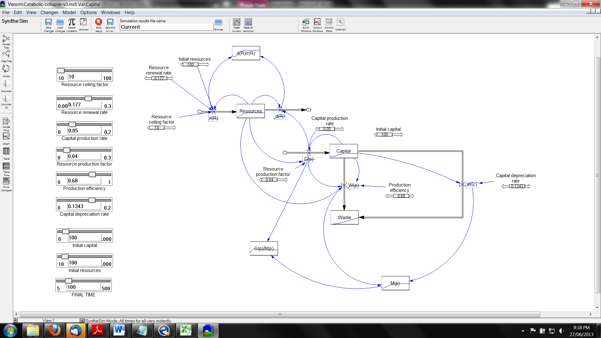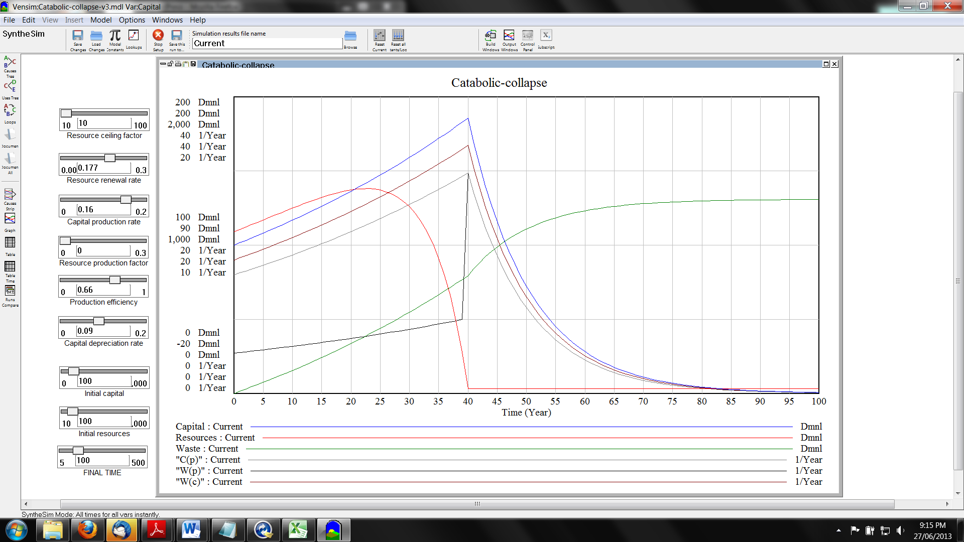 Once the model is loaded, the input parameters (see below) are set via the sliders or by typing values in the boxes at the left of the model area (see screen grabs at bottom of page). To set inputs, you need to first click the Synthesim button in the tool bar at top (green arrow on grey square, to right of Simulation results file name). The behaviour of the stocks and flows is displayed via the graph at the location of each variable (again, see screen grab). To see a larger display of all stocks and flows on the same set of axes, click on Control panel in the tool bar at top, then in the box that opens, select the Graphs tab. The graph Catabolic-collapse will be highlighted; click the Display button to display the graph for the current inputs. Changing any input will automatically close both the graph window and the control panel.